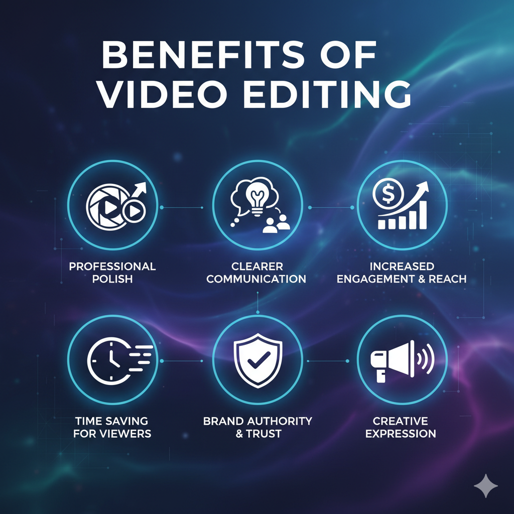 ​Strong Brand Identity: Editing ensures your brand's look and feel—including colors, logos, and text style—remain consistent across all your video content, building trust and recognition.
