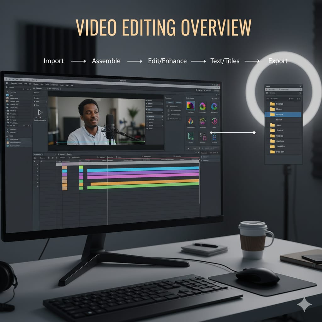 A video editing course overview includes learning how to use industry-standard software like Adobe Premiere Pro or DaVinci Resolve, along with mastering core concepts like storytelling, visual effects, color correction, and audio editing. Courses range from foundational and beginner-level classes to comprehensive professional programs, often combining hands-on practice with theory to prepare students for careers in media and entertainment.